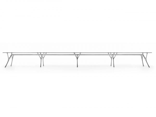 Ein Untergestell aus Aluminium trägt die Tischplatte aus Glas. Dieses ist gehärtet und transparent, die Kanten sind geschliffen. Die Befestigung der Tischplatte am Gestell erfolgt über Scheiben aus Edelstahl, die an das Glas geklebt werden. Der Pegaso Infinito ist ein modulares Tischsystem. Er kann modulweise unbegrenzt verlängert werden, auch über die angebotenen 720cm hinaus. Er verbindet italienische Eleganz mit überzeugender Funktion.